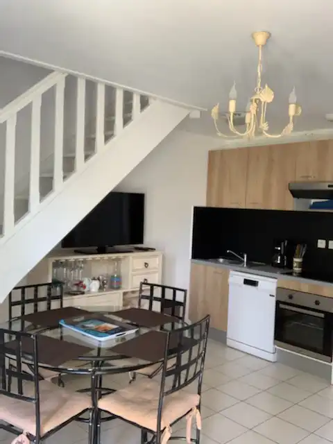 - Cuisine toute équipée : 4 plaques vitrocéramiques, hotte aspirante, four, évier, micro-ondes, lave-vaisselle, congelateur